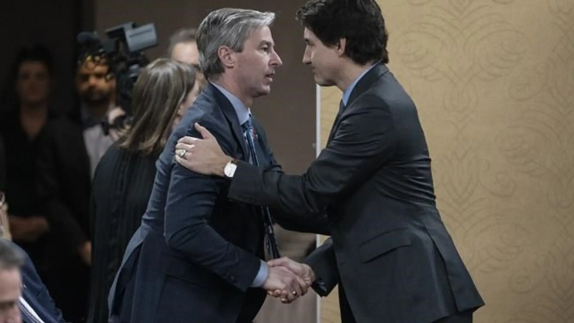 The Canadian Press Prime Minister Justin Trudeau, right, is greeted by Nova Scotia Premier Tim Houston in Truro, N.S. on Thursday, March 30, 2023. Houston has joined a call from leaders across the country asking for a meeting with Trudeau about carbon pricing. THE CANADIAN PRESS/Darren Calabrese −−>