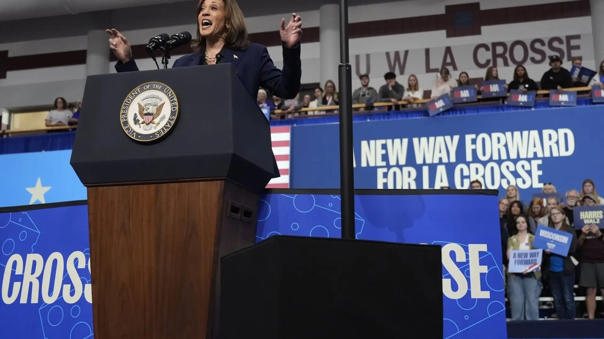 At Harris' next stop in Wisconsin, at the University of Wisconsin-La Crosse, her remarks focused on Trump and his falsehoods around the Jan. 6, 2021, riot at the U.S. Capitol.