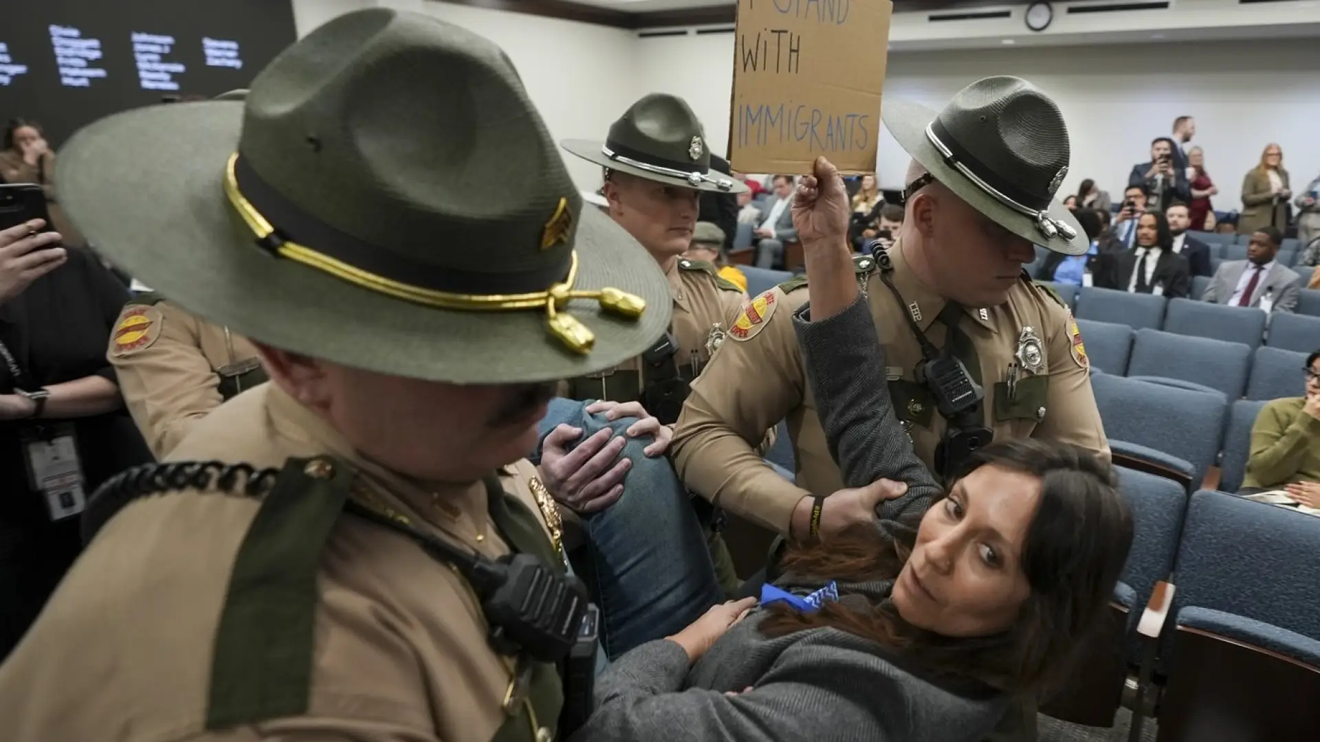 At least three women holding up signs were ejected from a House committee hearing Wednesday on immigration. They were carried by state troopers after the women had been warned to be quiet.