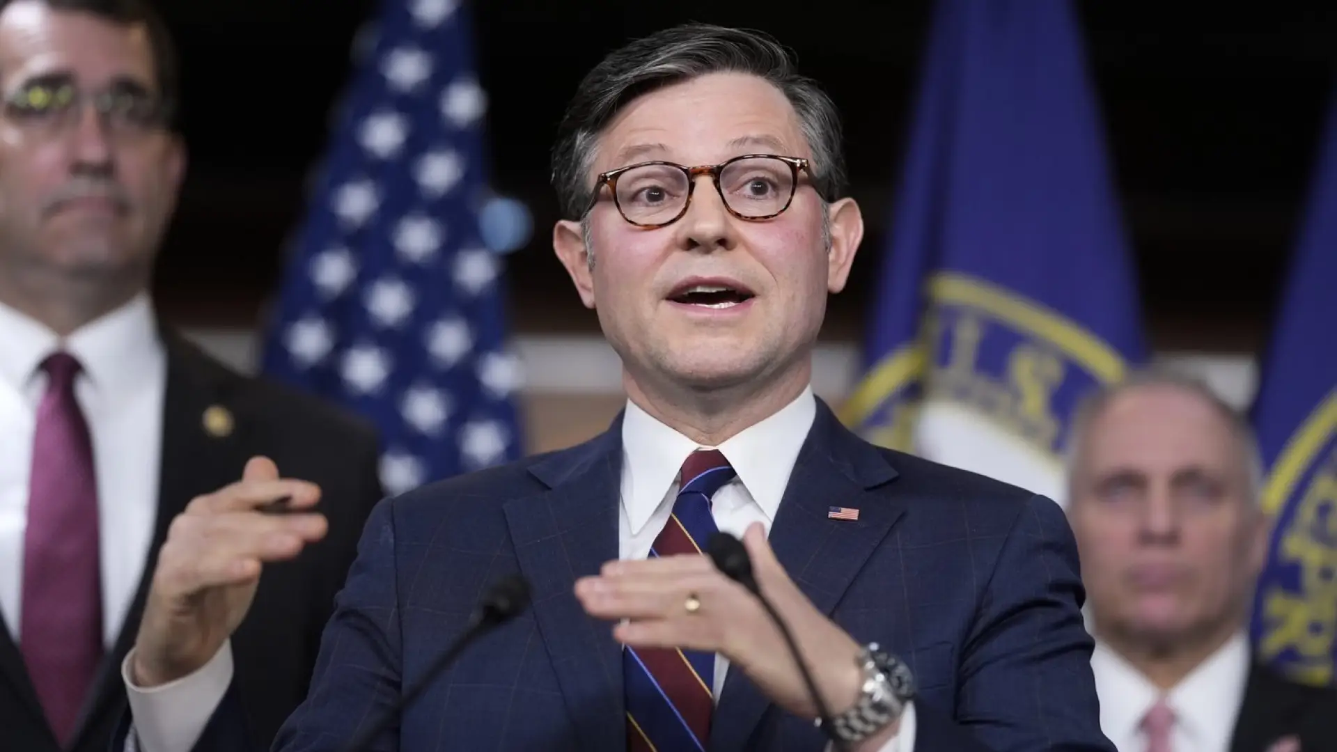 Speaker of the House Mike Johnson, R-La., takes questions on tariffs while meeting with reporters at a news conference, at the Capitol, in Washington, Tuesday, April 1, 2025. (AP Photo/J. Scott Applewhite)