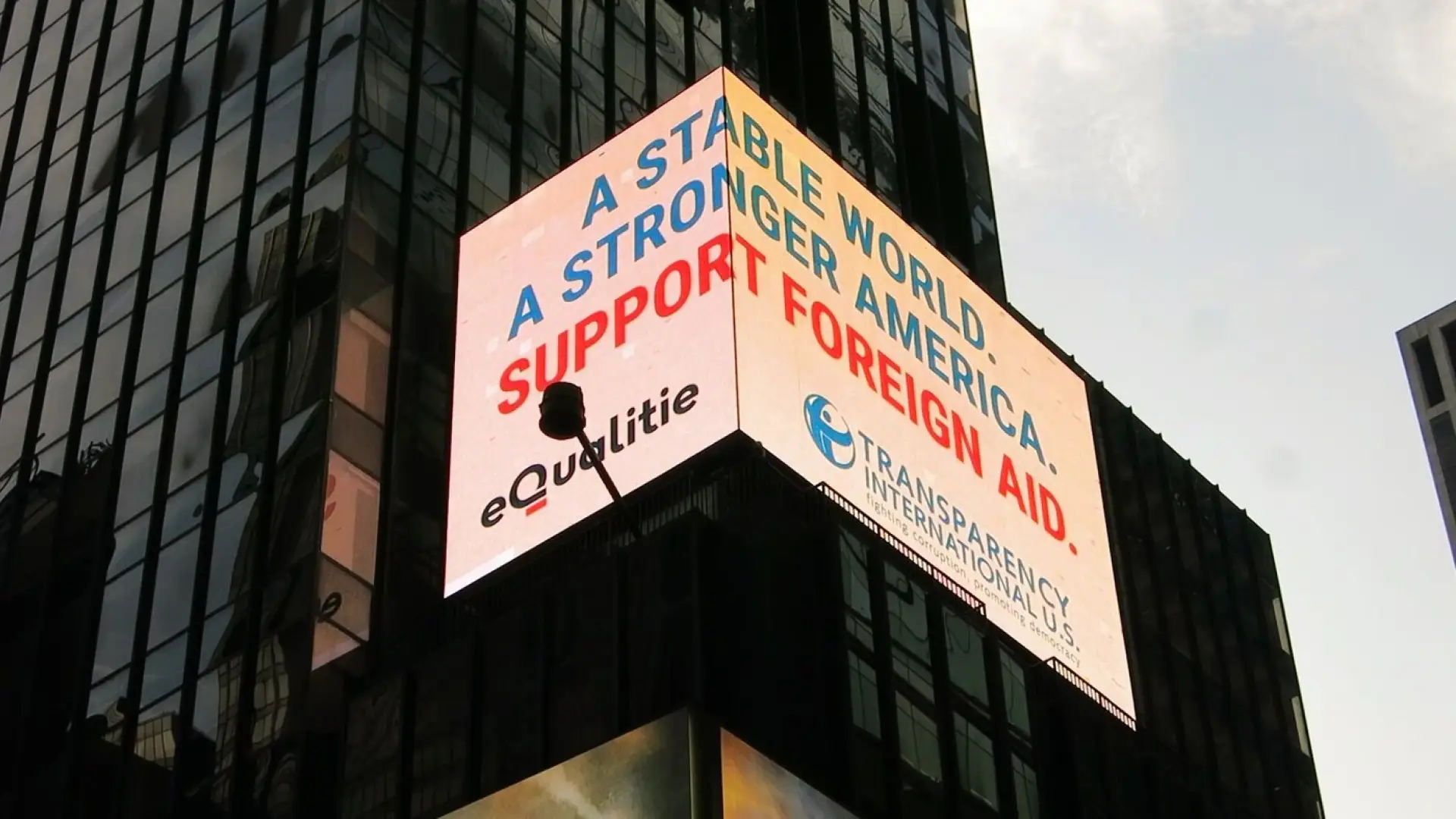 Dalessio's group has partnered with the American branch of Transparency International to post a 10-second message urging Americans to "support foreign aid" on a video billboard in the heart of Manhattan over 90 days.