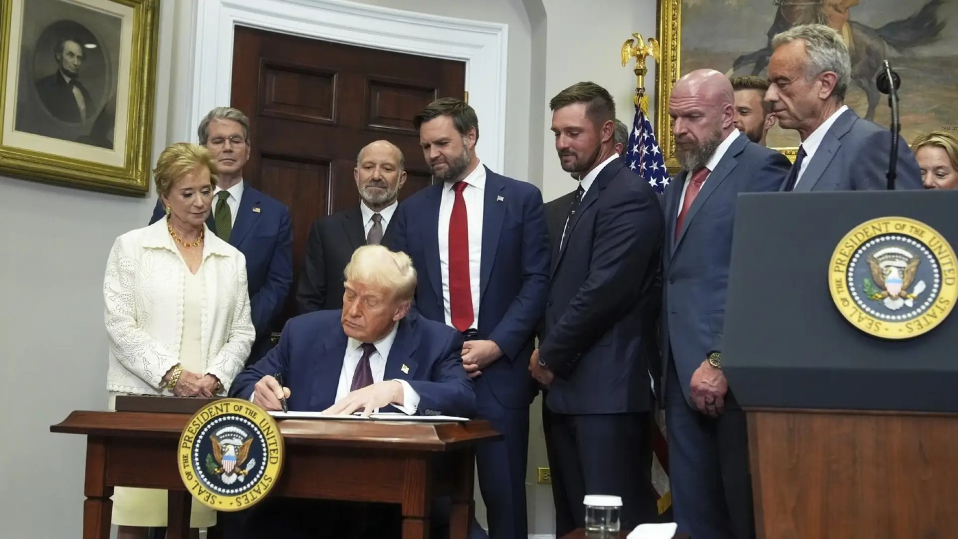 They include Trump friend and pro golfer Bryson DeChambeau; Kansas City Chiefs kicker Harrison Butker; Swedish golfer Annika Sorenstam; WWE chief content officer Paul "Triple H" Levesque, the son-in-law of Trump's education secretary, Linda McMahon; and former New York Giants linebacker Lawrence Taylor, a registered sex offender.