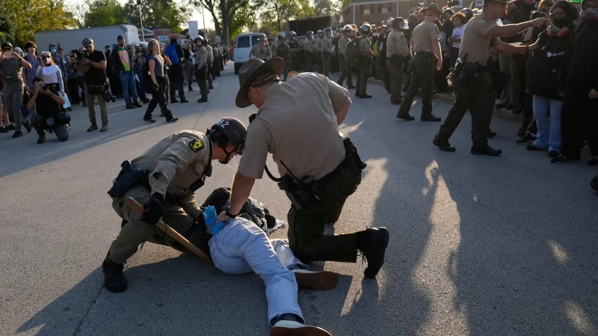 Others were angered by local and state officers standing shoulder-to-shoulder with federal agents, including Homeland Security Investigations, ICE, the Bureau of Prisons and others. At one point, Illinois State Police joined Border Patrol in pushing back a crowd.