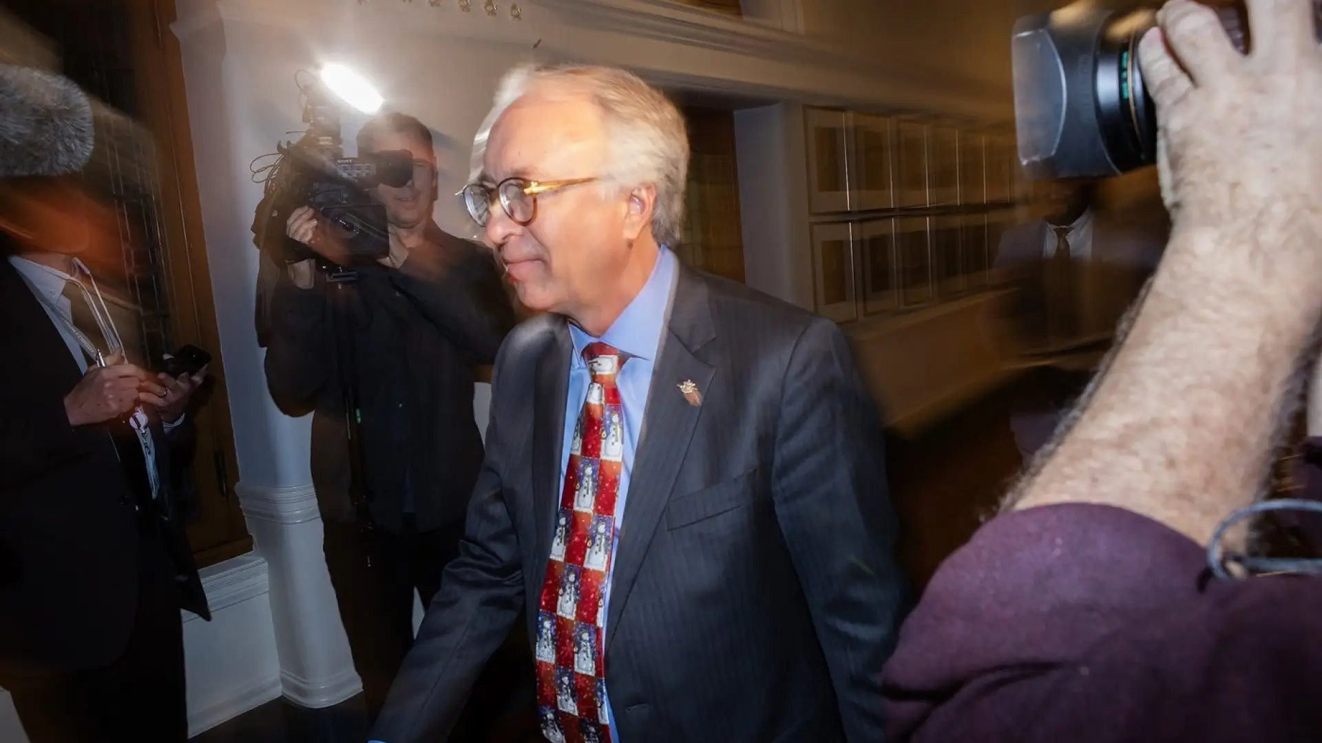 B.C. Conservative Leader John Rustad leaves the legislative house as media try to ask questions while at the B.C. Legislature in Victoria on Wednesday, December 3, 2025. THE CANADIAN PRESS/Chad Hipolito