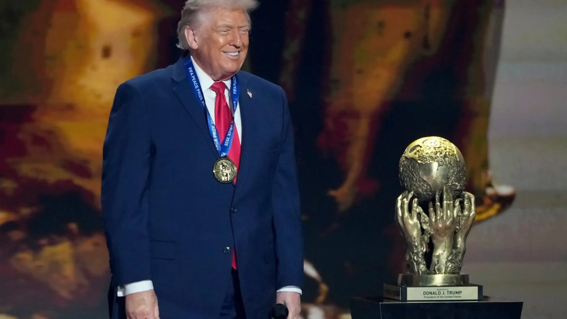 The president wore the medal around his neck and stood near a gold trophy that bore his name, depicting hands holding up the world, as he accepted the new FIFA peace prize at the 2026 World Cup draw.