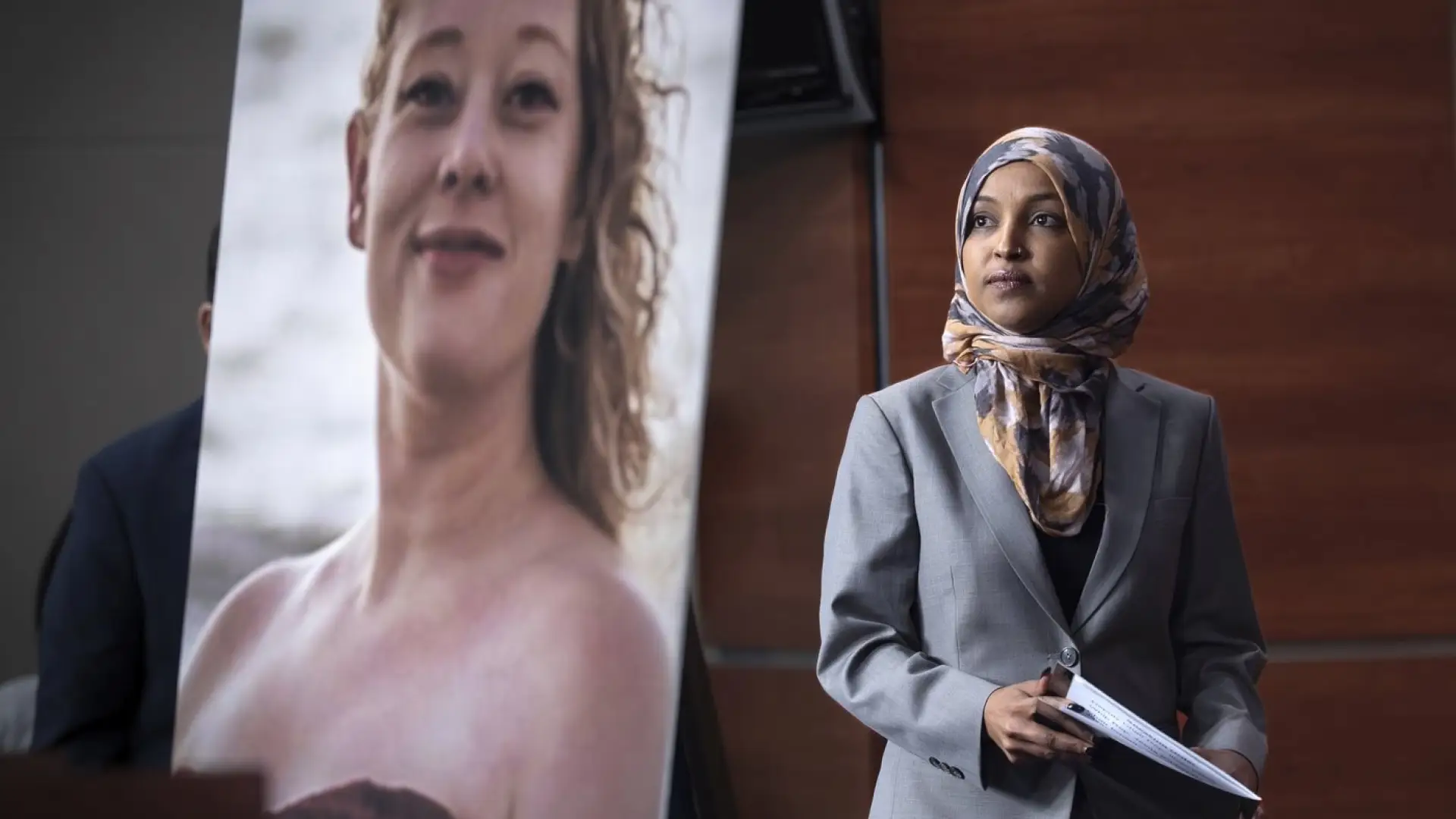 MINNEAPOLIS (AP) -- A man wearing a black jacket was tackled to the ground after spraying an unknown substance on U.S. Rep. Ilhan Omar at a town hall she was hosting in Minneapolis on Tuesday.