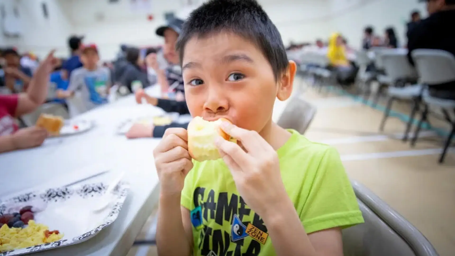 A joyful bite into a fresh apple at Sakku School in Coral Harbour. Through the partnership between Breakfast Club of Canada and Agnico Eagle, moments like this support a healthy start to the day and highlight why food security matters.