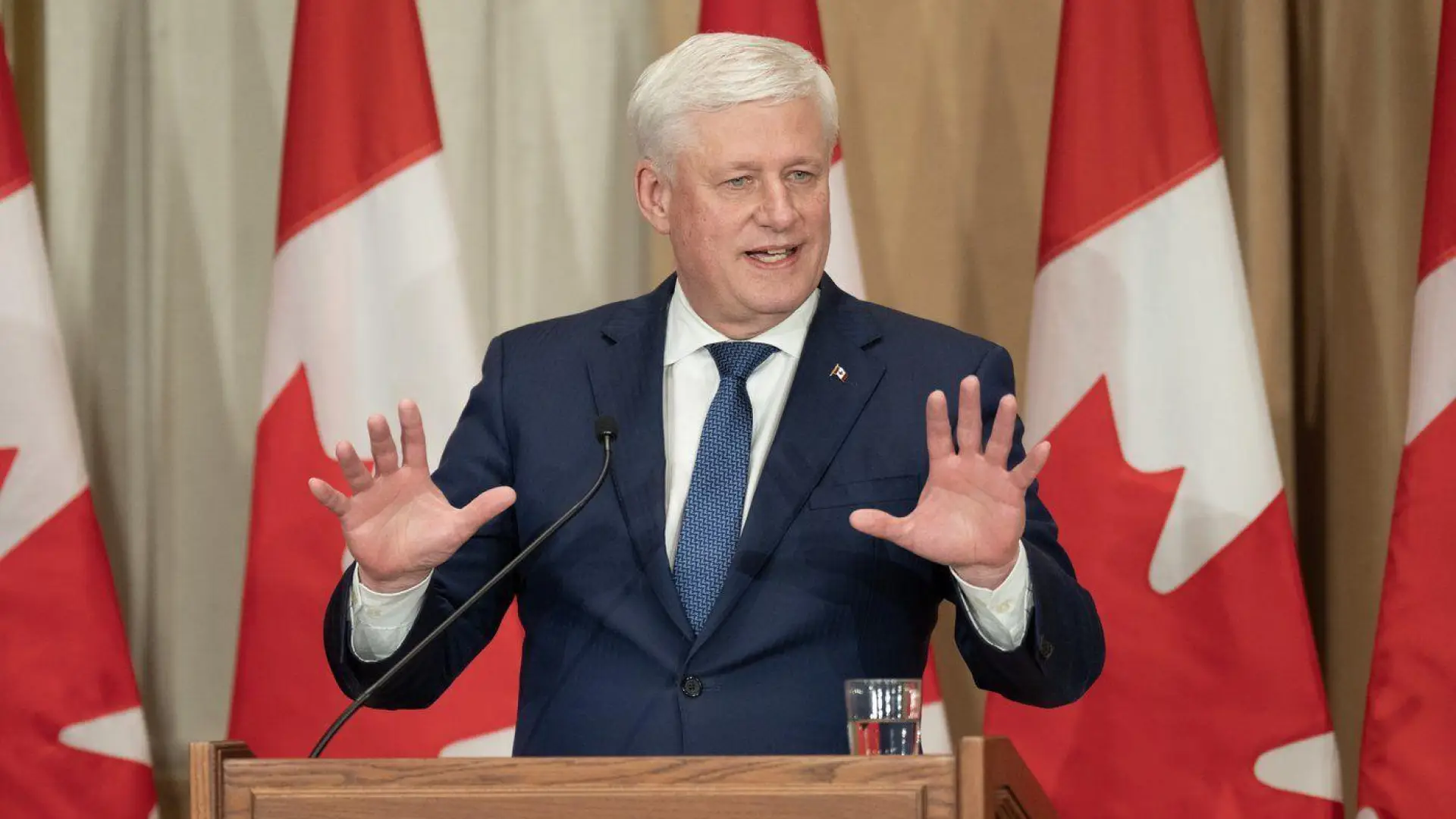 In his speech, Harper said Canada is facing a unique challenge — a hostile U.S. government that has openly questioned Canadian sovereignty, broken trade commitments and that regularly makes threats against the country.