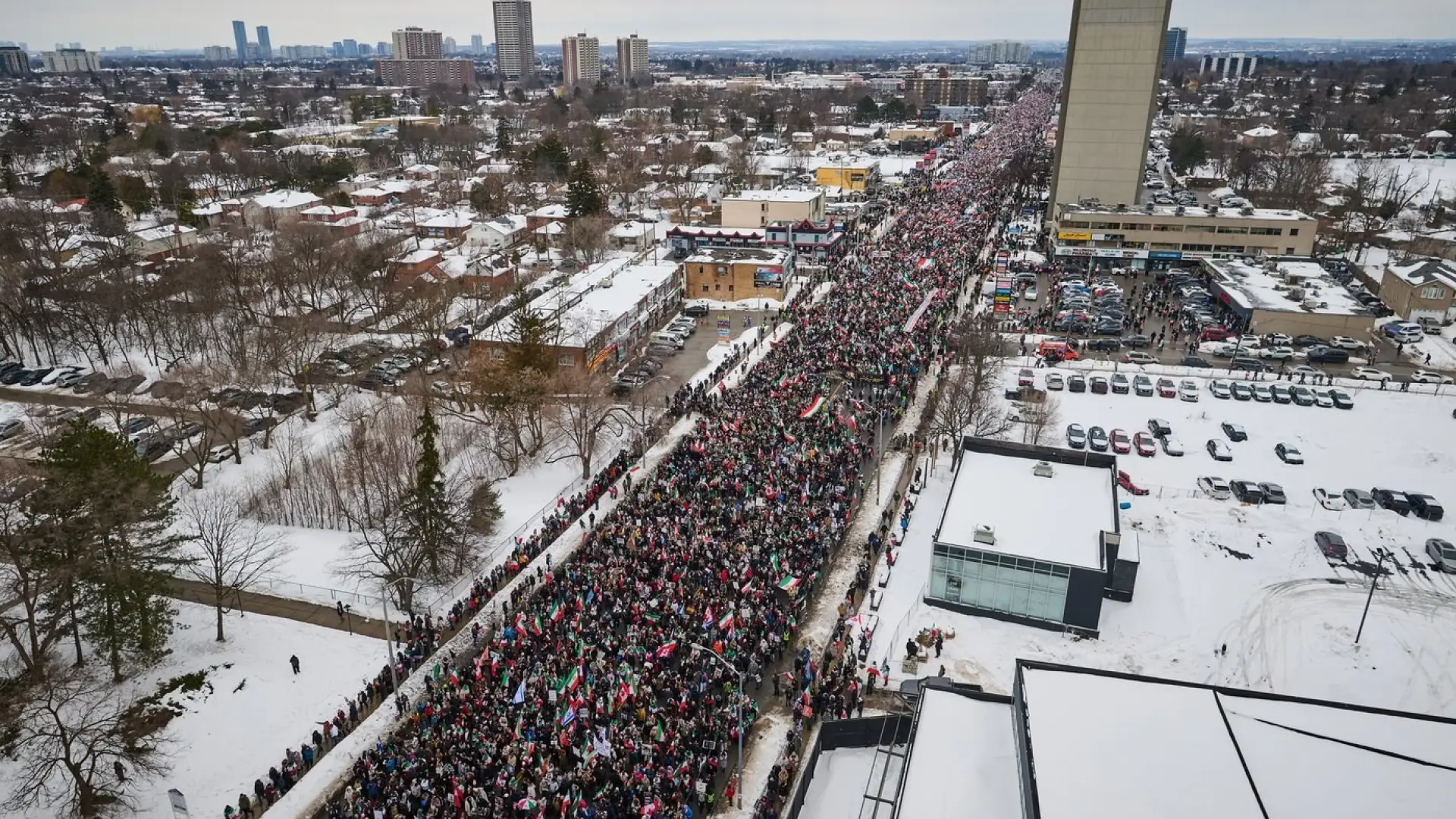 TORONTO -- Tens of thousands of people marched down Yonge Street to the beat of drums and chants of "King Reza Pahlavi" at a rally in North York, as similar protests took place in major cities around the world.