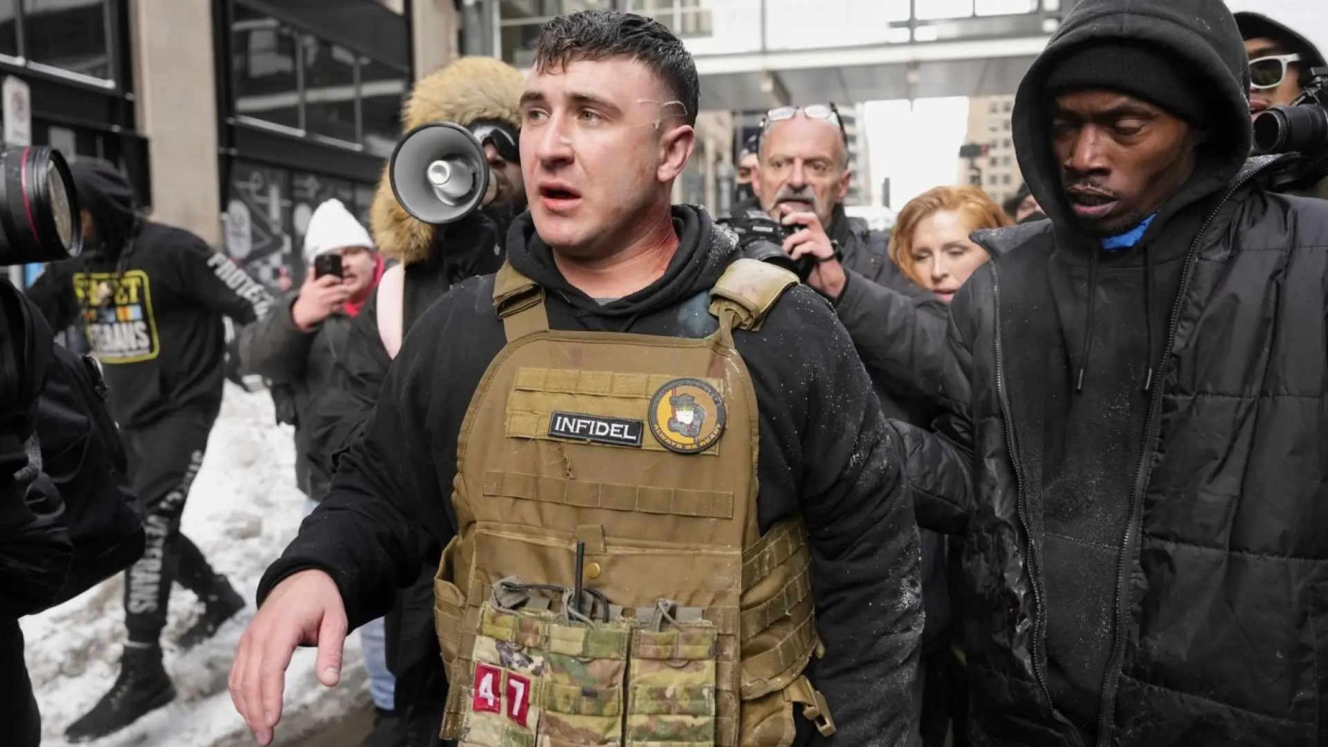 Tensions continued to heighten, she said, when someone in the counterprotest lit and threw a device she described as smaller than a football into the protesting crowd of about 20 people.