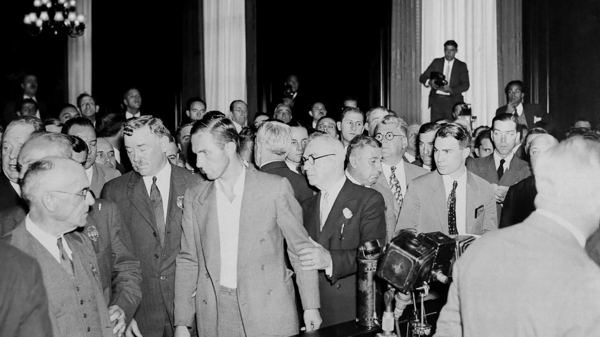 Hundreds of reporters and dozens of photographers chronicled the proceedings. Popping flashbulbs repeatedly startled witnesses and some photographers reportedly climbed on tables to get their pictures.